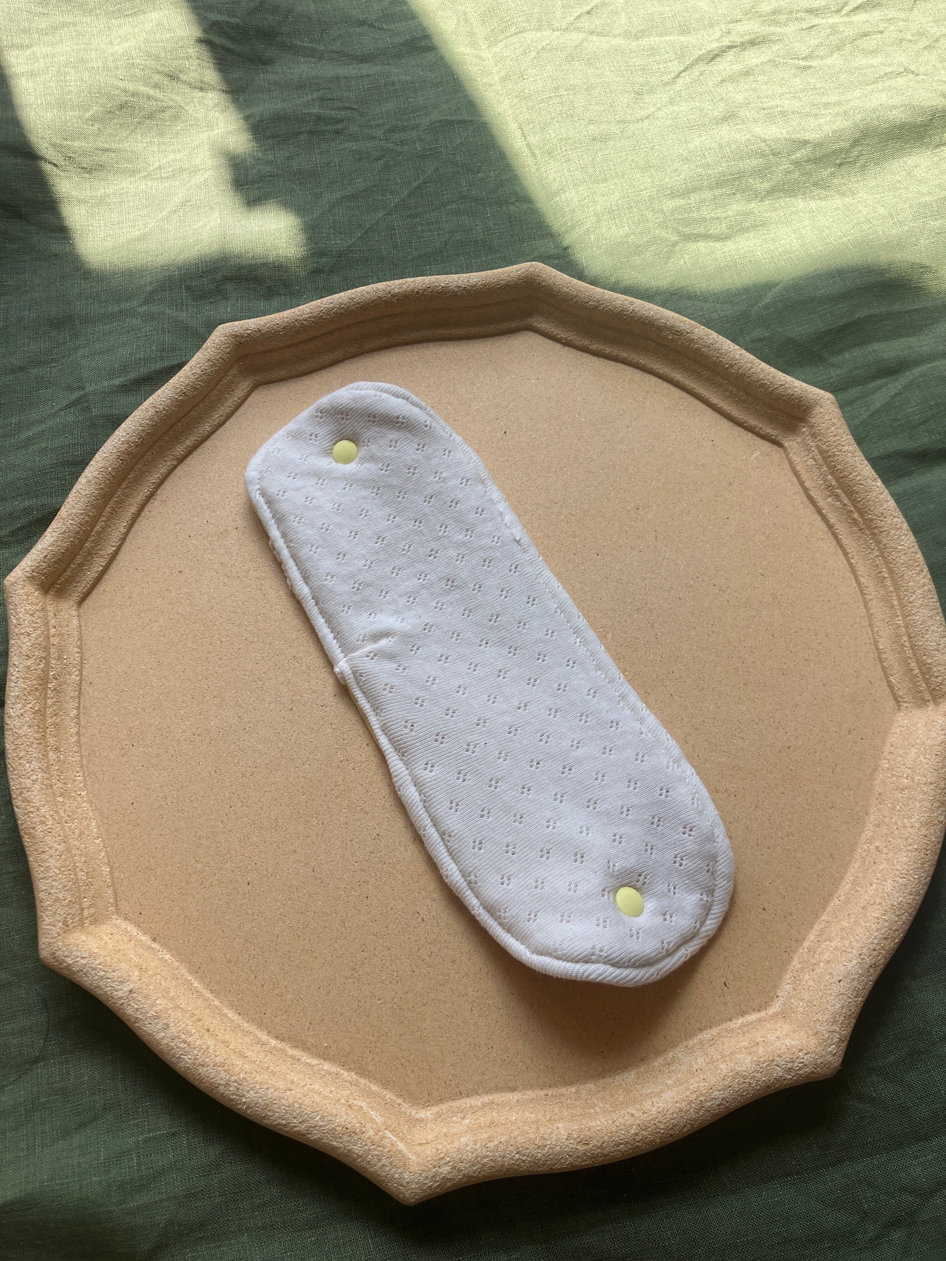 上下に付いているスナップはベースに取り付けるためのものです。洗い替え用に数枚お持ちいただけるとベースが汚れにくく長持ちします。